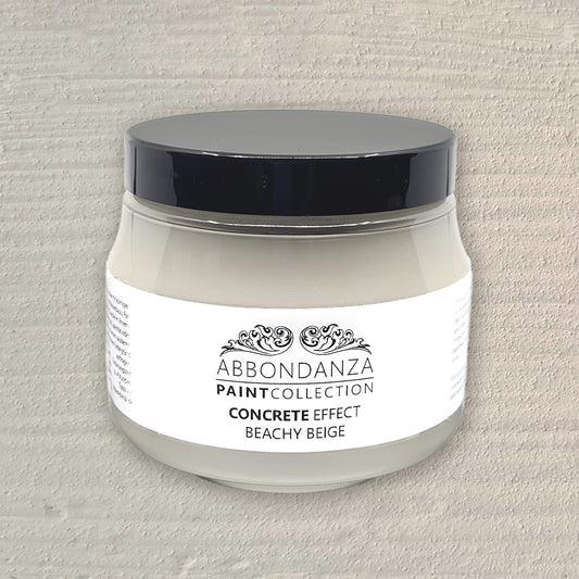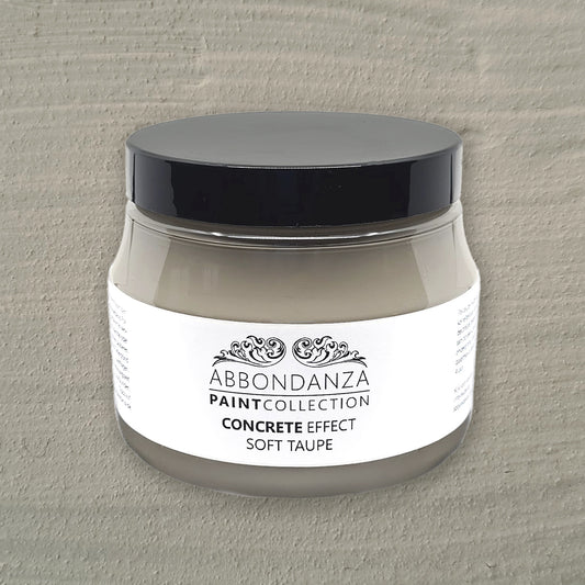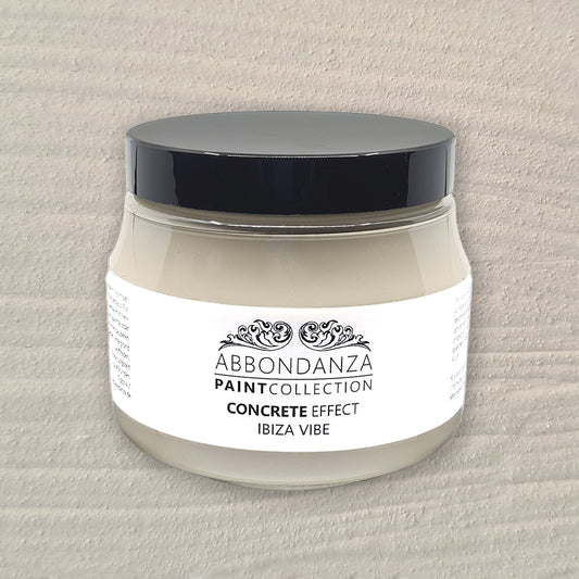 Abbondanza Concrete Effect is een matte verf met een dikke consistentie en lichte korreltextuur, voor het creëren van een stoer beton- of steen effect op vazen, potten, lampvoeten, schalen, kandelaars, beelden, of kleine meubelstukken. De wijze van aanbrengen, met een kwast, paletmes, spatel of spons, bepaalt het effect.